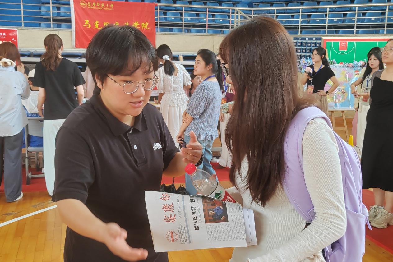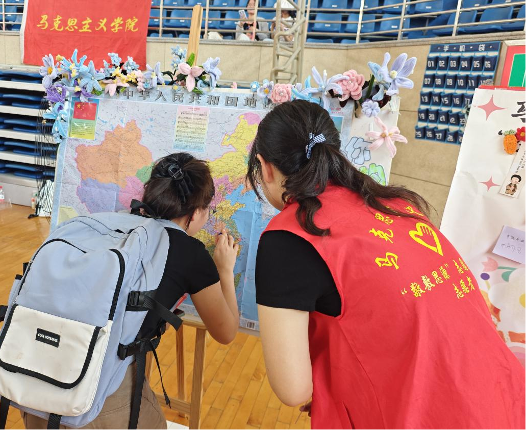 在报到点,公司也设置了一系列互动游戏,这些活动不仅拉近了新生与陌生环境的距离也记录下新生们对未来的美好憧憬。“很多新生是第一次离开家乡,所以我们做了这个地图,让大家在地图上找出自己的家乡,共同完成这个小小的成长教育活动。”思想政治教育专业2023延乔班李玉婷介绍到:“好多同学来自一个地方,地图扎不上,我们就邀请大家找出自己想要去的地方,大家都很喜欢这个互动。”“你的幸运数字是15号对吧,那么请问邓小平理论的精髓是什么?”研究生党支部根据学科特色为研究生新生们准备了“紧张刺激”的“入学考试”。“我们准备了30道基础的理论题目,让大家小小地紧张一下,答出来以后就可以抽奖获得一个小礼品。”2024级马克思主义理论研究生潘玉龙介绍到。报到当天,2025级学科思政的新生包凯玲一直在报到点帮忙。“学长学姐们都很亲切,让我很想早点参与到集体的工作当中,也希望能早点认识新同学们。