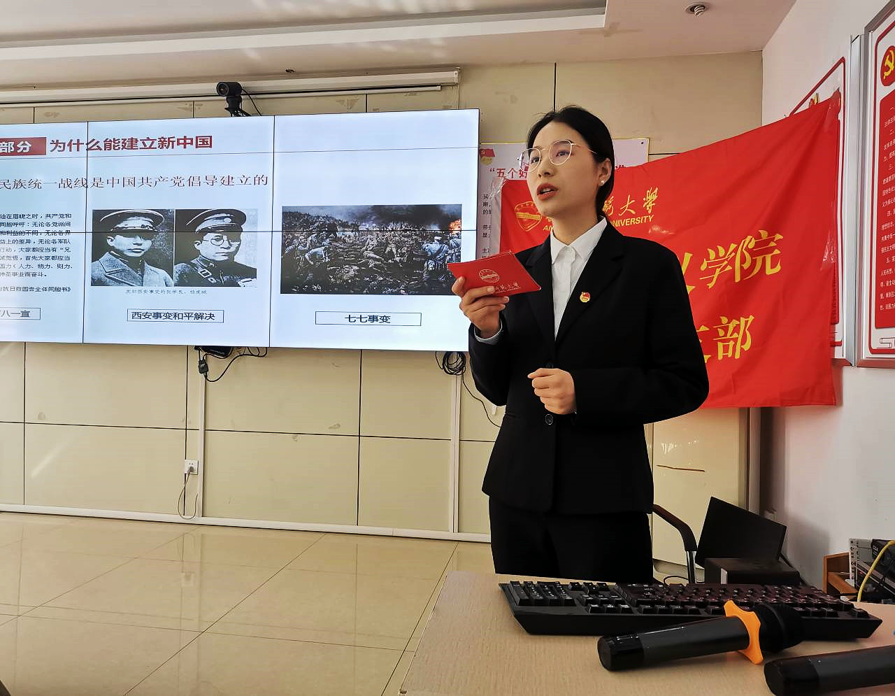 本次宣讲分为上下两场。第一场由宣讲团成员齐如梦紧紧围绕“中国共产党为什么能”作主题宣讲,主要从“为什么能建立新中国”、“为什么能收拾好国民党留下的烂摊子”两个部分依次展开。其中,她重点依据中国共产党坚定捍卫国家民族利益、解决农民土地问题、加强党内自身廉政建设等方面,论证“中国共产党能够建立新中国”的观点。