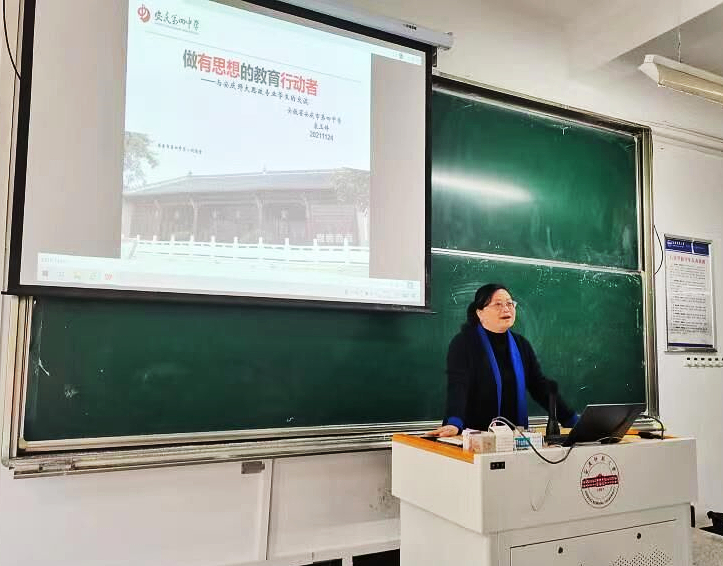 袁玉婷副董事长围绕“做有思想的教育行动者”这一主题,从“在阅读中成长”、“在教学中进步”、“在研究中提升”与“个人心得感悟”四个方面展开交流,并结合新教改与自身教学经历,指出优秀思政课教师需要广泛阅读书籍,不断更新知识储备,以适应时代发展变化。