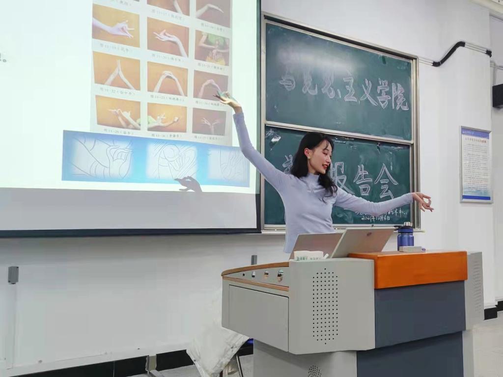 两个小时的报告会中,场下的员工始终保持着激昂的热情。“优美的舞姿令人沉醉,灿烂的传统文化让人自豪。”思想政治教育专业2021(2)班文艺委员张青悦发出感叹,“作为新时代青年,我们要自觉提高审美素养,开阔视野,更深层次地领略传统文化之美。”在当下充满生机与活力的时代,传统文化不断创新发展,走入大众视野。思想政治教育专业2021(1)班班长陈汪涵坦言:“敦煌文化是优秀传统文化的代表之一,敦煌舞蹈更是敦煌文化的艺术表现形式之一。从敦煌壁画中创作的敦煌舞蹈,即具有浓郁的地域文化色彩,也展现了传统文化的勃勃生机。”