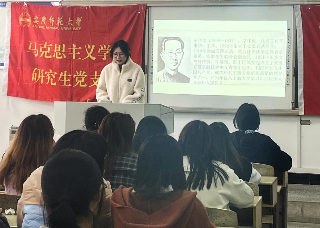 “临刑前一小时,他给爱人方启坤(当时化名复苏)写下亲笔信:‘复苏爱妻:我为革命死了,你不要悲哀,不要难过,应抚养爱生,以继予志。’并挥毫写下:‘唯大英雄能本色,是真君子自风流’。”说到这里,2021级马克思主义理论专业入党积极分子王思涵不禁哽咽。随后,她整理情绪接着向同学们介绍了王步文先烈的生平事迹,并通过向先烈致敬的方式借此发出要牢记初心使命,把红色基因一代代传承下去的誓言。