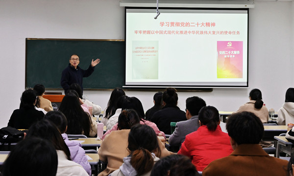 金文斌以“学习贯彻党的二十大精神——牢牢把握以中国式现代化推进中华民族伟大复兴的历史使命”为主题,围绕“全面建成社会主义现代化强国”和“以中国式现代化全面推进中华民族伟大复兴”详细介绍中国式现代化道路的特征和独特优势。在宣讲过程中,金文斌对宣讲团如何进行高质量的宣讲进行了指导,结合党的二十大精神对研究生的论文选题进行了分析。