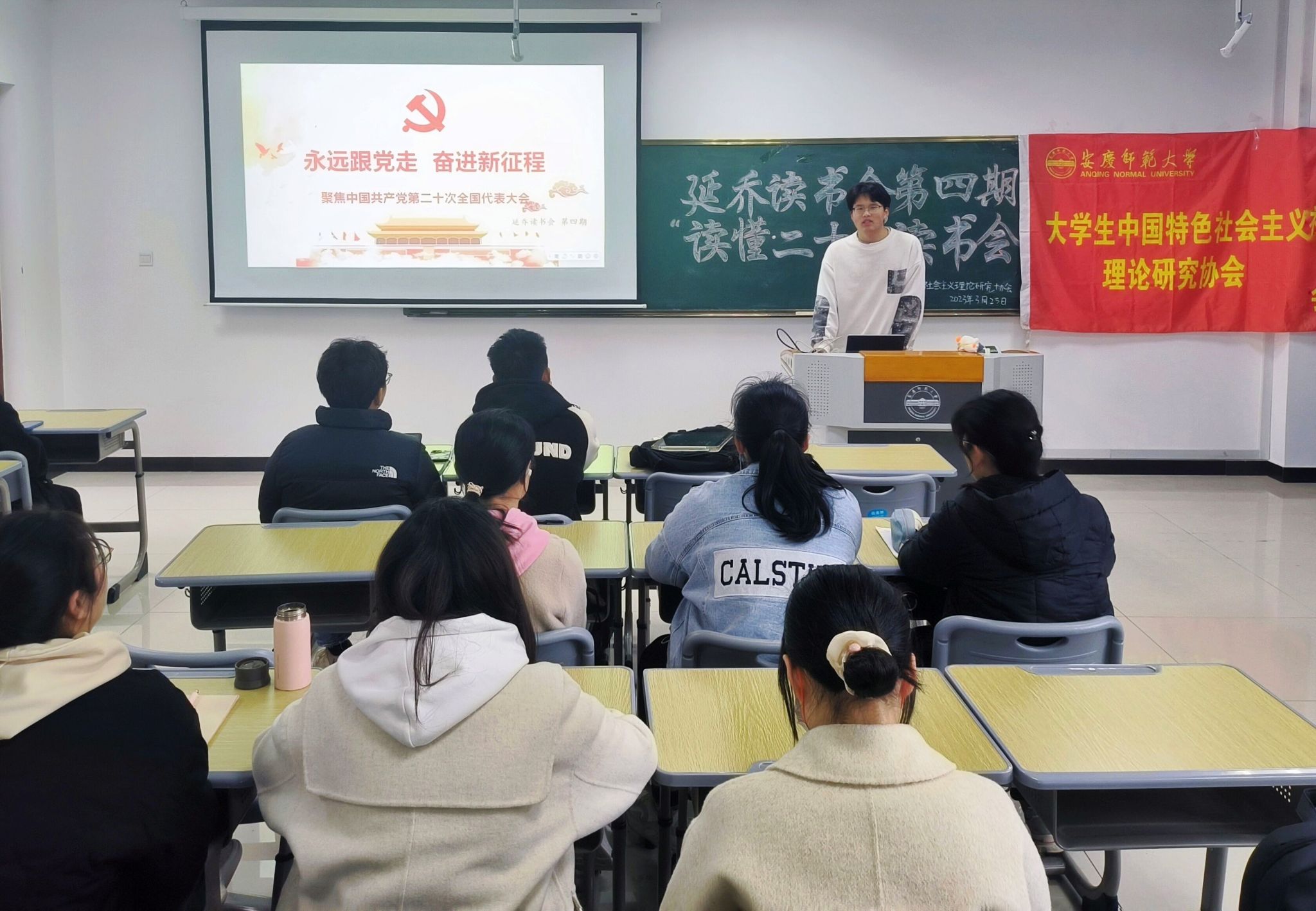读书会上,三位主讲人依次上台讲解了我国十年来取得的伟大成就,列举了中国特色社会主义建设的多方面成效,阐明了党的二十大报告的重大政治意义、理论意义、现实意义和历史意义,梳理了马克思主义中国化、时代化的历史进程,阐释了中国式现代化的特色和本质要求,以及全面建设社会主义现代化国家的目标任务,并以此激励同学们争做新时代好青年。主讲人与同学们积极互动、交流问题,现场反响热烈,同学们踊跃参与。