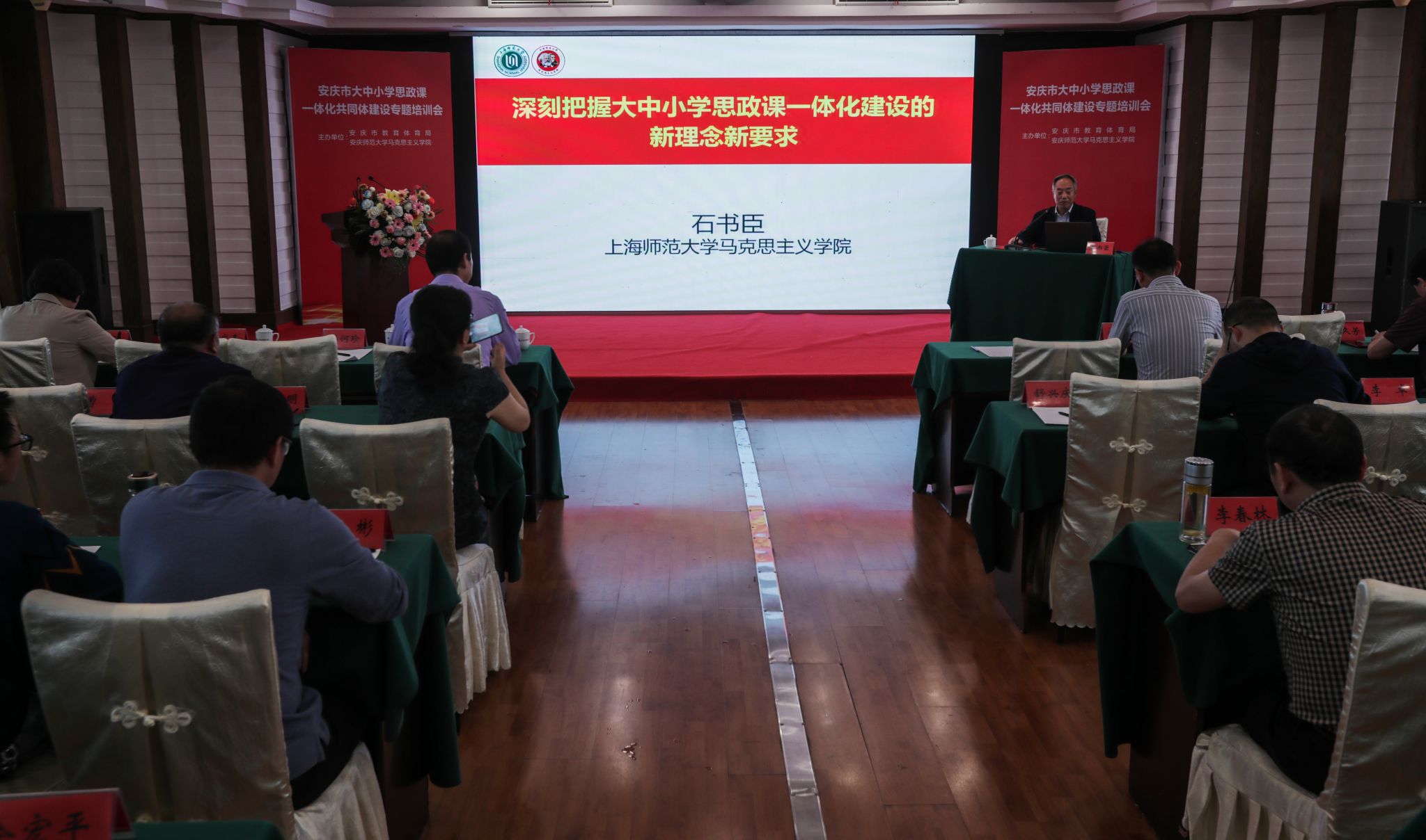 在专题培训会上,来自上海师范大学太阳成集团122ccvip博士生导师石书臣教授受邀作了题为“深刻把握大中小学思政课一体化建设的新理念新要求”主旨报告。在研讨交流阶段,安庆市大中小学思政教师进行了同题说课。