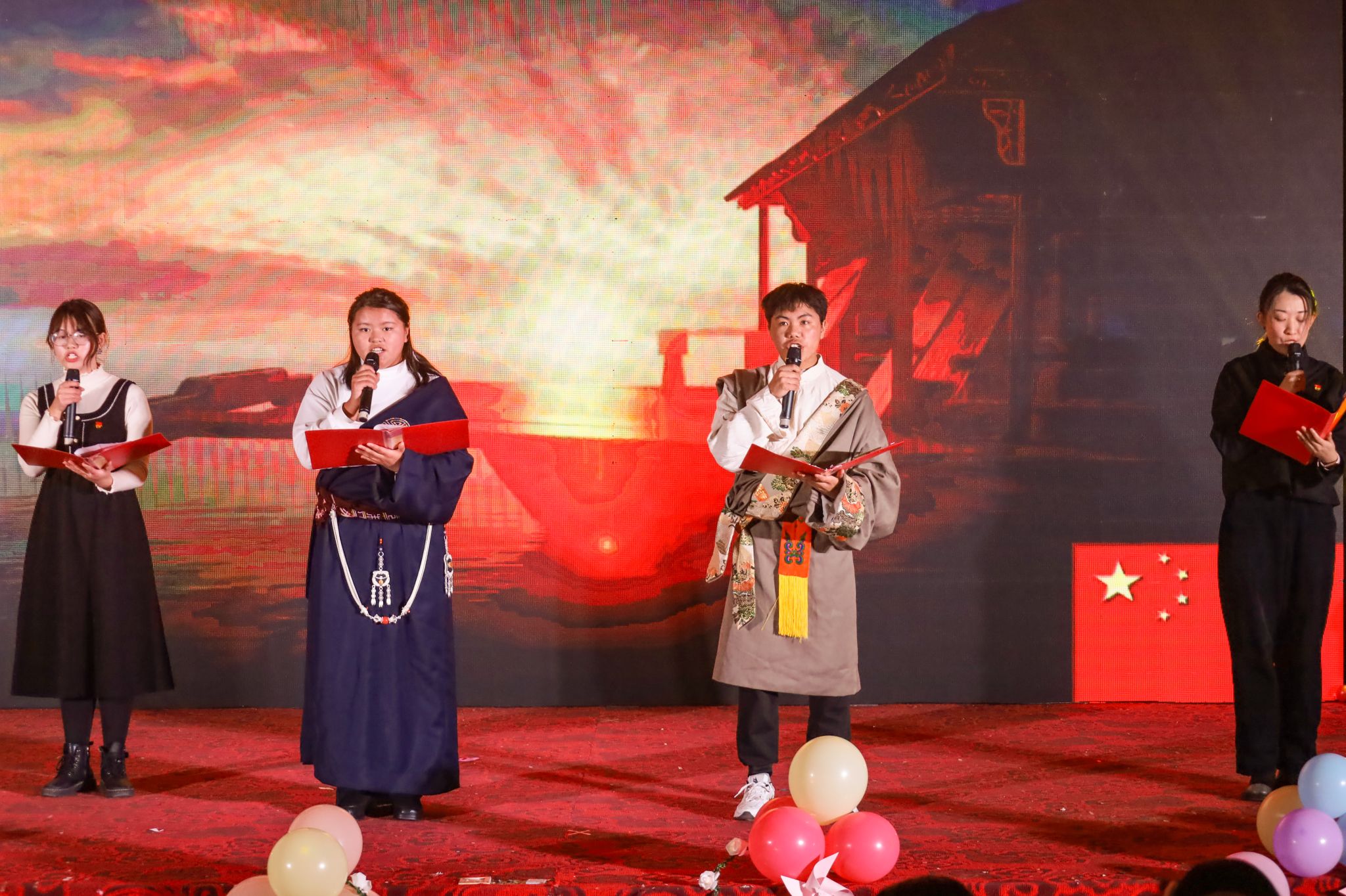 晚会分为“忆往昔·岁月如歌”“寻真理·梦想起航”“铸青春·灿烂成长”三个篇章,共12个节目。晚会从筹备到正式表演历经1个多月的时间,共有9种不同的各具魅力表演形式。“我们提前两个月就开始着手筹划本次晚会,经历多次规划、筛选、彩排等环节,以确保表演节目的质量。”晚会负责人之一、思想政治教育专业2022级(3)班的姚志伟说。