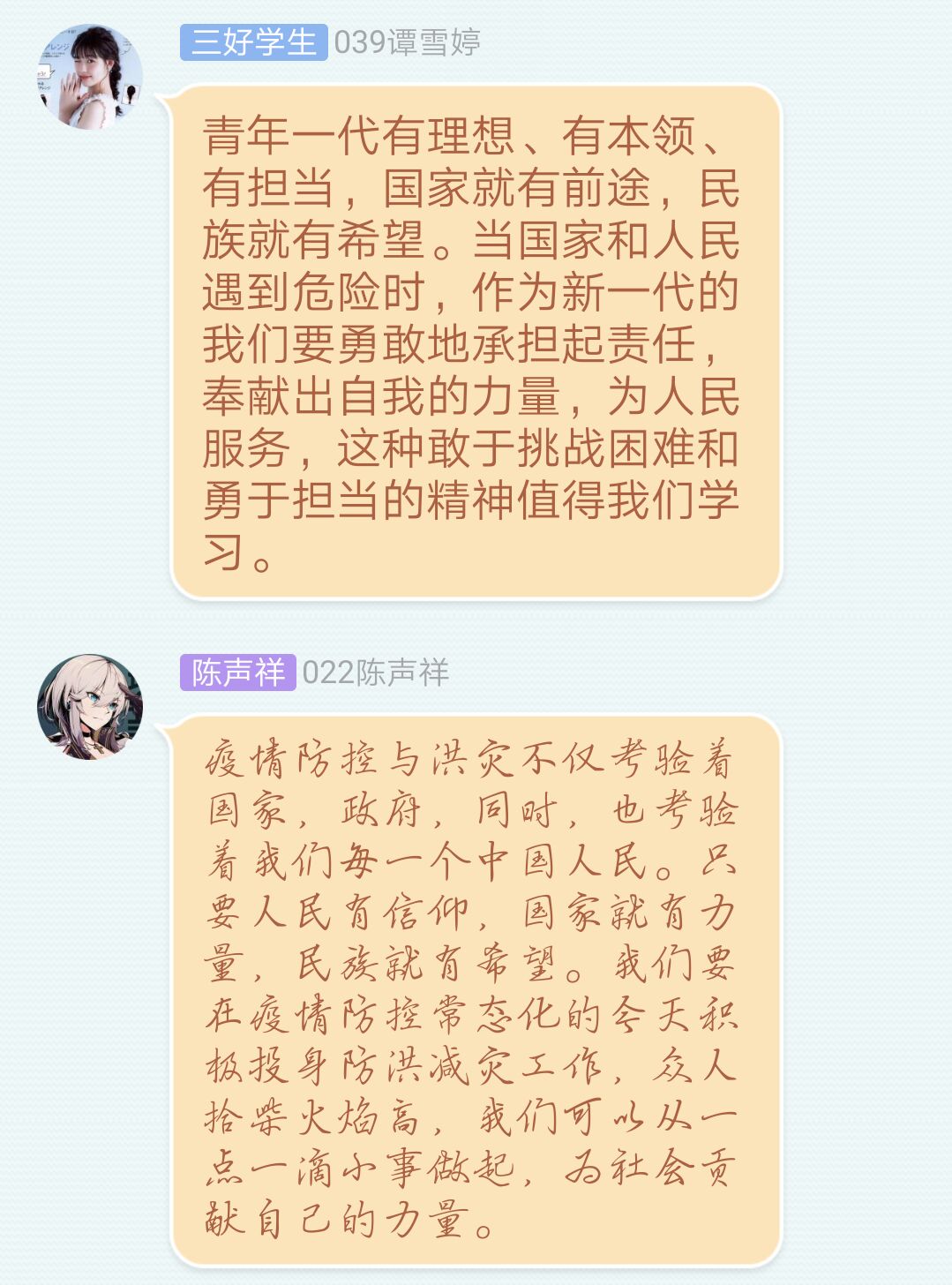 为了更好地宣传郑姣姣同学的先进事迹,太阳成集团122ccvip近日在全院召开“学习00后女老员工主动请缨先进事迹”的主题班会。各班同学通过群课堂一起观看了郑姣姣事迹的报道视频。观看结束后,同学们纷纷发表了感想。2019级思想政治教育三班的陈巍巍说:“我们身为平凡的人,小小的心里也应该承载着大大国家和故乡!在这种特殊时期,这种志愿服务的行为很值得我们学习!”“青年有责任有担当,国家和民族才有前途有希望。在社会和国家需要之时,我们应当挺身而出,努力奉献,彰显青年的责任与担当!”2019级思想政治教育专业的黄雨格同学说道。活动开展过程中,郑姣姣同学还与大家分享了自己的志愿服务经历和防汛安全知识。(撰稿:田梦甜 审核:金文斌)