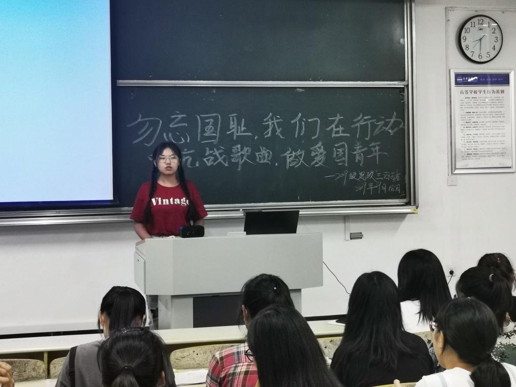 本次活动以纪念“九一八事变88周年”为主题,分为“集体默哀、用心聆听抗战歌曲、全体观看抗战片、自由阐述感想”四个部分展开。