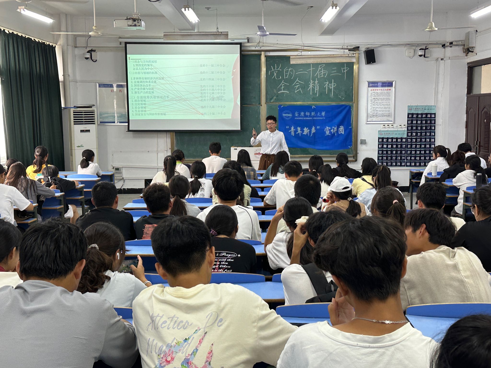 宣讲活动在热烈的氛围中展开。“历史和现实告诉我们,没有改革开放,就没有中国的今天,也就没有中国的明天。”宣讲团成员向同学们介绍了党的二十届三中全会召开的时代背景和重大历史意义。宣讲团成员以“我们为什么要学习党的二十届三中全会精神”为主题,通过对于国内和国外形势的分析,强调党团结带领人民进行全面深化改革和我们学习党的二十届三中全会精神的必要性。“新征程上,我们不仅面临着推动高质量发展、更好适应我国社会主要矛盾变化的现实需要,还要应对复杂性、严峻性、不确定性上升的外部环境。”宣讲团成员通过对于老员工所面临的就业压力等现实问题,结合党的二十届三中全会通过的《中共中央关于进一步全面深化改革、推进中国式现代化的决定》有关内容,让同学们更加深刻地了解了我们学习党的二十届三中全会精神的必要性。宣讲团成员勉励同学们要勇于奋斗,敢于拼搏,争做时代先锋,展现青春力量。新征程上,要坚定不移进一步全面深化改革,为推进中国式现代化贡献青春力量。