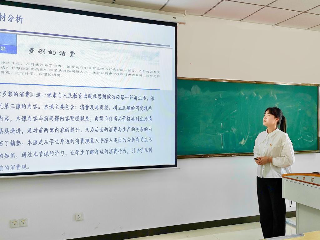 从教学设计、课件制作到说课、现场上课,四项考核环节均是对师范生理想信念、道德情操和扎实学识的考验。“经过这次比赛,我了解到,作为一名师范生,不能只学不练,还要有感情、有思想、有效果地去上好这堂课,让思政课在我们的讲授中最大程度发挥价值引领的作用。”思想政治教育专业2020级(2)班何玲在正式参加比赛前进行多次演练,力求用有温度的语言、有逻辑的思路和有价值的内容讲好这15分钟,正是亲身体验才让她真正体会到“教书育人”的使命光荣。