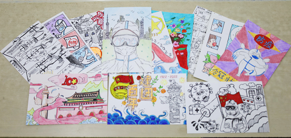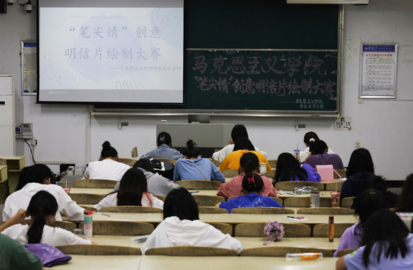 “华表象征着路标,引领着共青团的前进方向。浪花寓意着当今中国越来越多的共青团员前赴后继,绸带则代表着未来的美好道路。”思想政治教育专业2021(2)班的余兰选择了第二个主题进行创作,“恰逢建团一百周年,这份明信片算是我对中国共青团的一份献礼。”作为一名共青团员,在完成自己的作品后她感到无比自豪。
